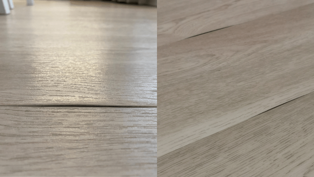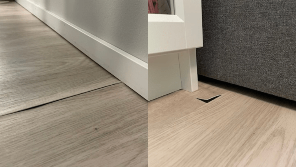 Tämä ei siis kuitenkaan ollut syynä, miksi tein varsinaisen lattiareklamaation elokuussa 2021. Syynä reklmaatiolle oli se, että lattian saumat alkoivat irvistämään. Alla kuvat, jotka lähetin 21.8.2021 Orimattilan Värisilmän kauppiaalle sekä Kotimestarit Oy:n toimitusjohtajalle. Orimattilan kauppias reagoi asiaan nopeasti (Kotimestarit ei millään tavalla), mutta sen jälkeen kaikki eteni kuin hidastetussa kauhuelokuvassa. Uusi lattiahan meille asennettiin vasta joulukuussa 2023.